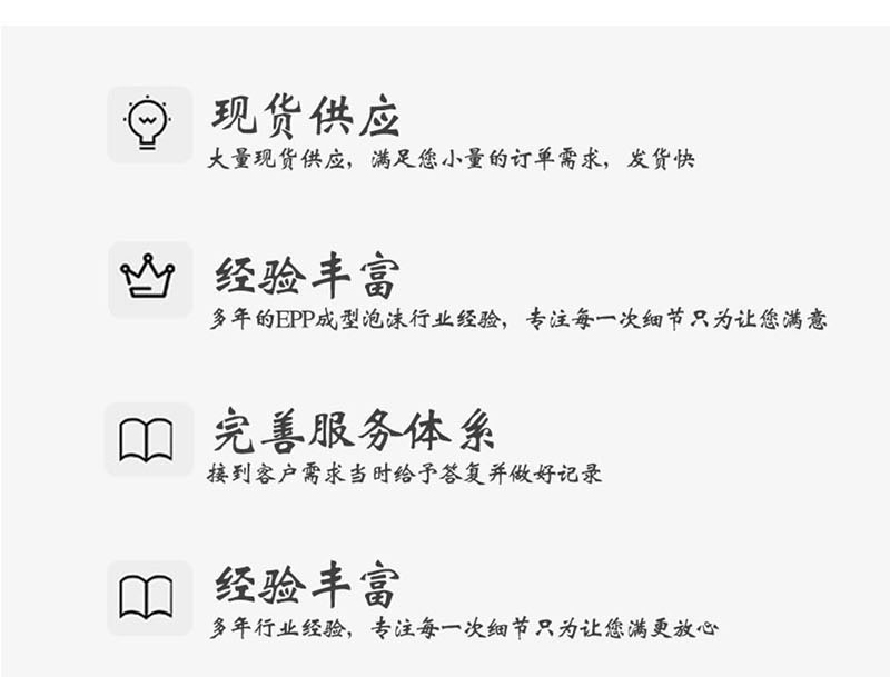 富揚擁有專業團隊,豐富的生產經驗保證客戶的產品質量和效率,富揚專注EPP包裝制品行業多年。擁有專業售后團隊,為您各種的問題答疑解惑,有什么不明白的不懂的都可以咨詢我們的客服,給您滿意答復。